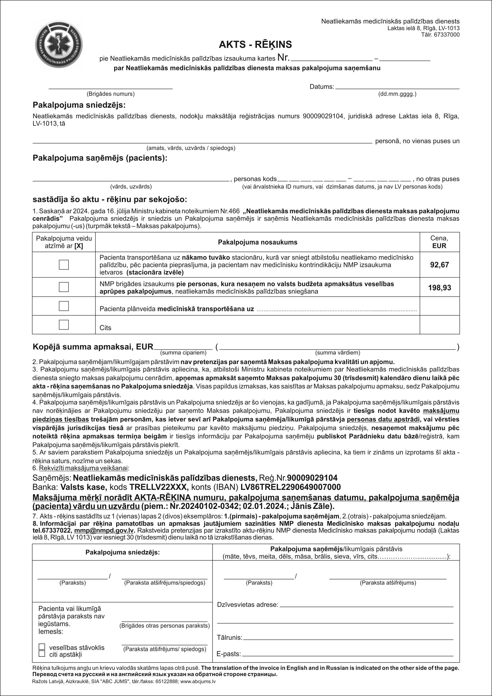 - Tām iedzīvotāju grupām, kuras nav minētas Veselības aprūpes finansēšanas likumā un Latvijas-Ukrainas starpvalstu līgumā, par NMP brigādes sniegto palīdzību izsaukuma laikā tiek izrakstīts akts-rēķins. Tas nozīmē, ka šiem citu valstu iedzīvotājiem mūsu valstī sniegtā medicīniskā palīdzība netiek segta no Latvijas valsts budžeta līdzekļiem.
